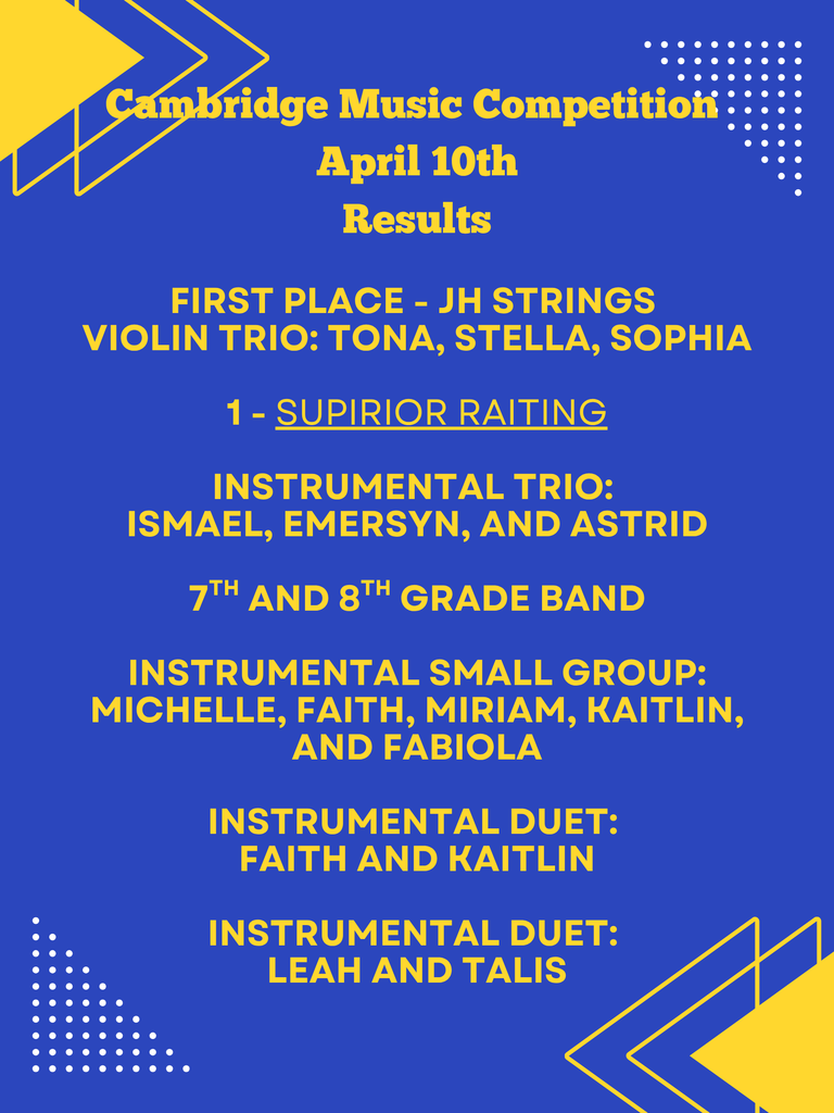 The 5th, 6th, 7th, and 8th students competed at the Cambridge Music Competition last Friday. The Violin Trio took First Place for Junior High Strings. Out of our 22 performances 6 received a Superior Rating, and 13 received an Excellent Rating.